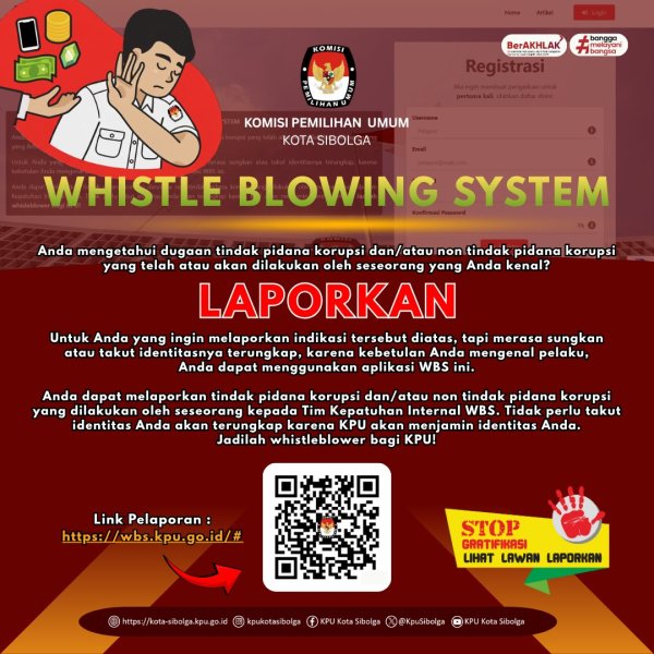 Whistleblowing System adalah sistem yang disediakan oleh KPU Kota Sibolga bagi anda yang memiliki informasi dan ingin melaporkan suatu perbuatan yang berindikasi pelanggaran yang terjadi di lingkungan KPU Kota Sibolga.