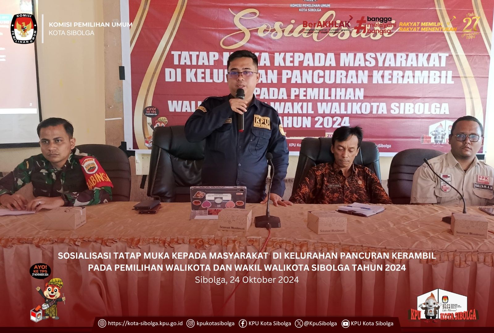 Sibolga - KPU Kota Sibolga melaksanakan Sosialisasi Tatap Muka Kepada Masyarakat di Kelurahan Pancuran Kerambil pada Pemilihan Walikota dan Wakil Walikota Sibolga Tahun 2024 di Aula Kantor Camat Sibolga Sambas, Kamis (24/10/2024).