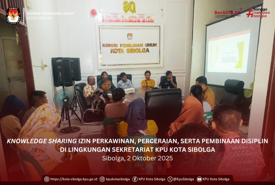 Sibolga - Sekretariat KPU Kota Sibolga melaksanakan Knowledge Sharing Izin Perkawinan, Perceraian, serta Pembinaan Disiplin di Kantor KPU Kota Sibolga, Kamis (2/10/2025).