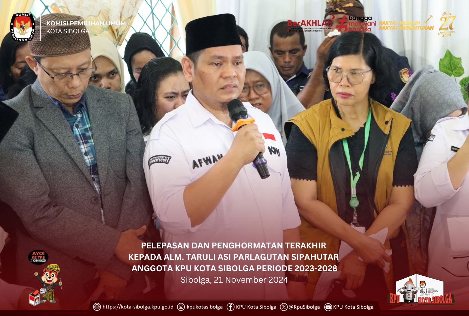 Sibolga - KPU Kota Sibolga melaksanakan Pelepasan dan Penghormatan Terakhir kepada Alm. Taruli Asi Parlagutan Sipahutar Anggota KPU Kota Sibolga Ketua Divisi Hukum dan Pengawasan periode 2023-2028 yang meninggal pada tanggal 18 November 2024 di RSU F.L. Tobing Sibolga.