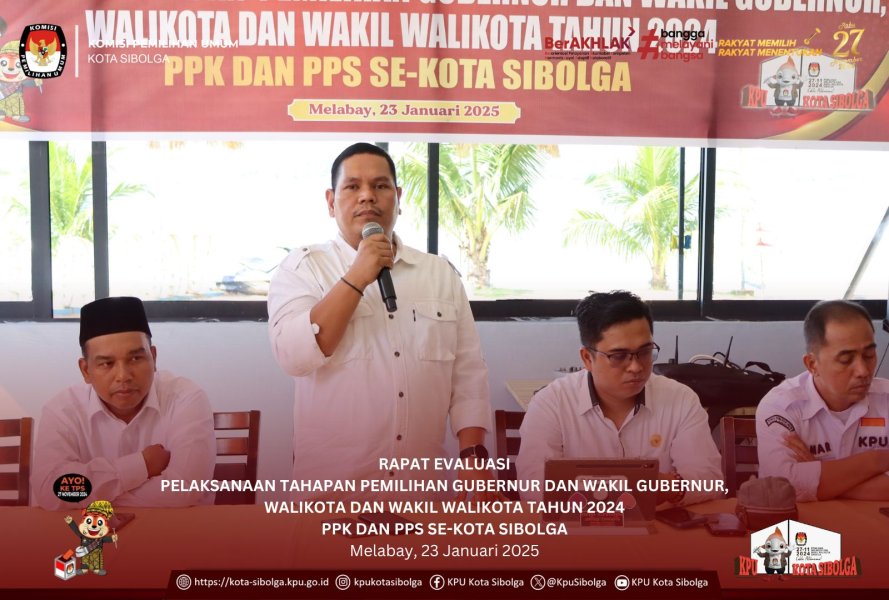 Ketua KPU Kota Sibolga Afwan Nasution dalam sambutannya meminta kepada undangan yang hadir agar menyampaikan masukan terhadap kendala-kendala yang terjadi sepanjang tahapan Pemilihan Walikota dan Wakil Walikota Sibolga Tahun 2024. Kegiatan ini juga dilaksanakan dengan tujuan untuk penyempurnaan laporan evaluasi Pemilihan Walikota dan Wakil Walikota Sibolga Tahun 2024.