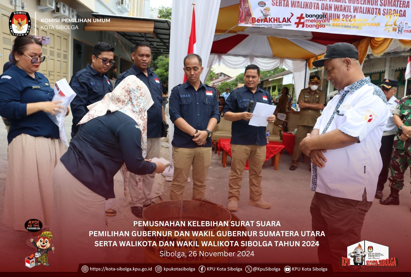 Pemusnahan surat suara yang lebih dan rusak secara langsung dilaksanankan oleh Ketua KPU Kota Sibolga Afwan Nasution didampingi Anggota KPU Kota Sibolga Armansyah Sinaga, Asmaruddin Nasution dan Rahmad Kurniawan serta Sekretatis KPU Kota Sibolga Tirta Adi Putra Pasaribu.
