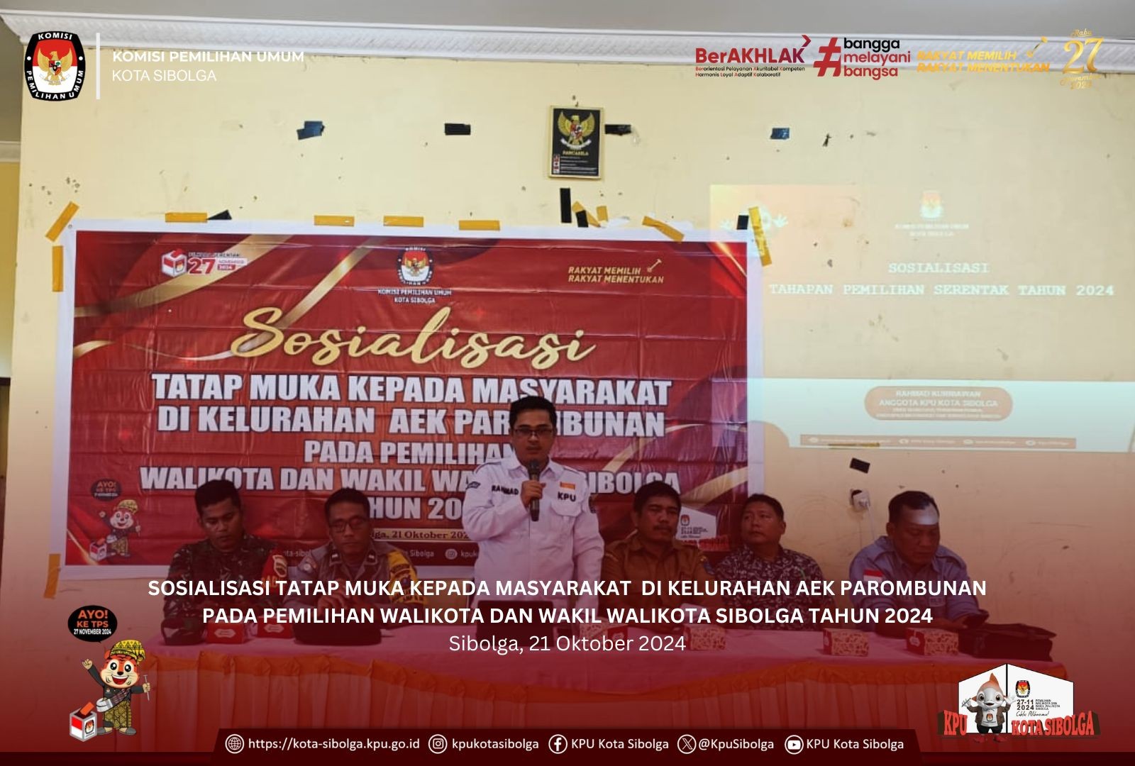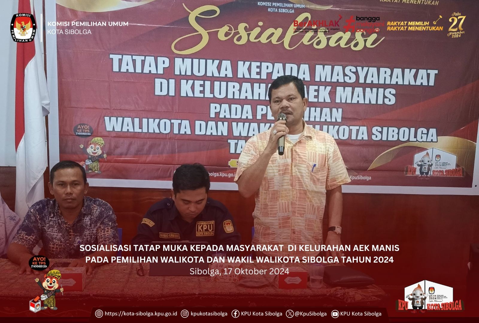 Sibolga - KPU Kota Sibolga melaksanakan Sosialisasi Tatap Muka Kepada Masyarakat di Kelurahan Aek Habil pada Pemilihan Walikota dan Wakil Walikota Sibolga Tahun 2024 di Aula Kantor Lurah Aek Habil, Jum'at (18/10/2024).