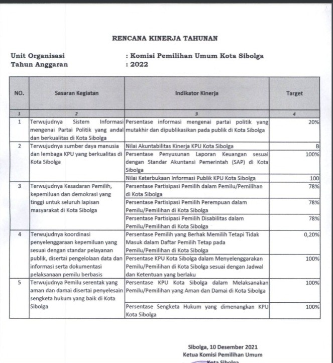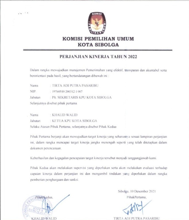 Perjanjian Kinerja Sekretariat KPU Kota Sibolga Tahun 2022 Sabtu, 01 Januari 2022 07:00 98 Berikut diumumkan Perjanjian Kinerja Sekretaris KPU Kota Sibolga Tahun 2022, PK DAN RK SEKRETARIS 2022.pdf Baca Selengkapnya