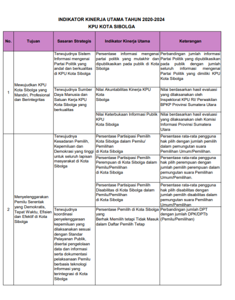 Indikator Kinerja Utama (IKU) KPU Kota Sibolga Tahun 2020-2024 Sabtu, 01 Januari 2022 07:00 93 Berikut diumumkan Indikator Kinerja Utama (IKU) KPU Kota Sibolga DISINI Baca Selengkapnya